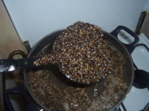 Pour la cuisson j’utilise l’eau de trempe ,à laquelle j’ajoute 2 sucres cela rend les graines plus brillantes , quand l’eau est à ébullition ,surveiller les graines de chanvres ,lorsque 1/3 des graines ont germées ,couper la chauffe puis rincer les graines immédiatement sous l’eau froide sinon les graines continueront à cuire et lors de l’eschage se casseront .